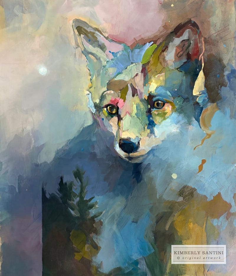 Eutierria means being one with nature. It seemed the perfect title for a fox melting into a moon studded midnight sky, as the northern lights danced behind her (who was awed by them earlier this week?, framed by foggy deciduous trees and evergreens.