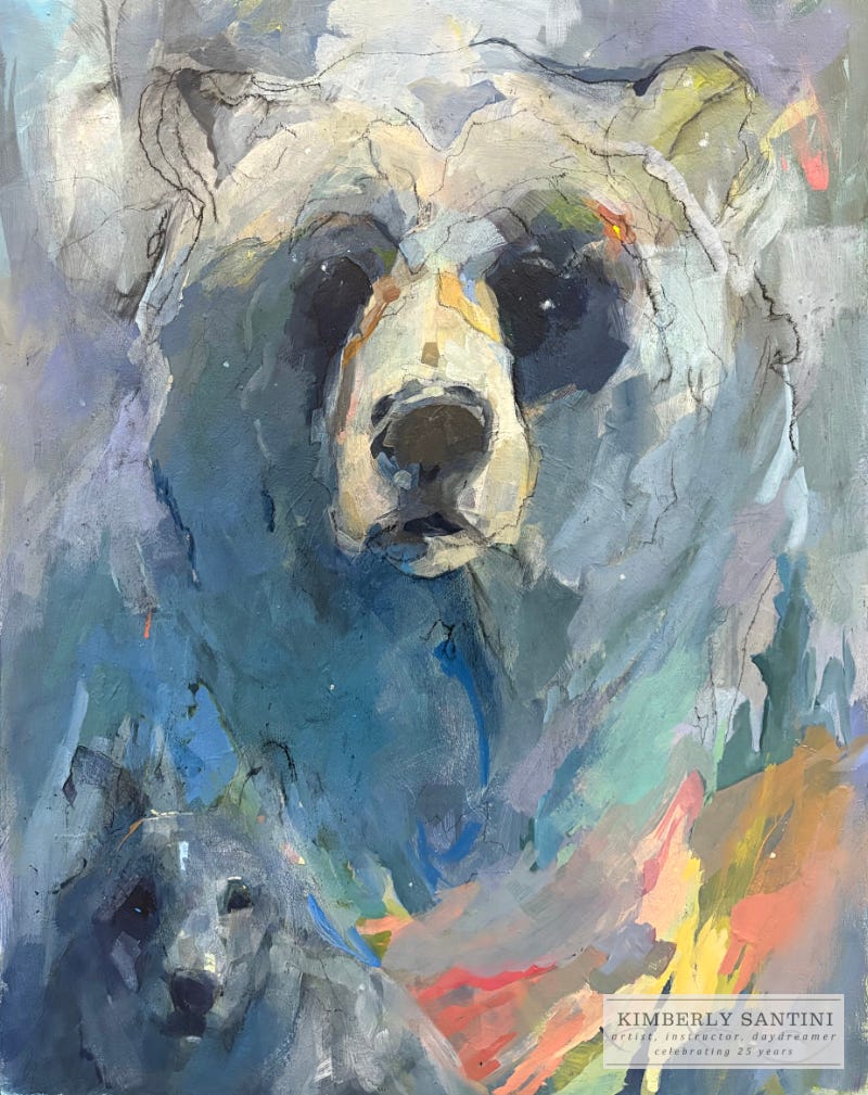 This girl started when I was clearing a mess of studies from my drawing area and these two pieces aligned. I had dreamt of wolves a couple nights prior and of course, with Renee Good and other current affairs on my mind, momma bears were in the mix too. So I set out to make a painting about maternal strength.