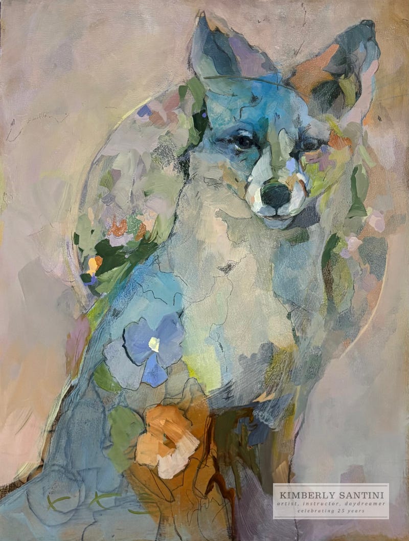 Vulpine is my first completed painting after returning home from a masterclass with British painter Emily Ball and 13 other incredible artists. I learned an extraordinary amount while there about how to amplify intentions and deepen the resonance of my art. I then spent the last week reflecting on the experience while building an action plan to keep me on track exploring the things unearthed with Emily.**