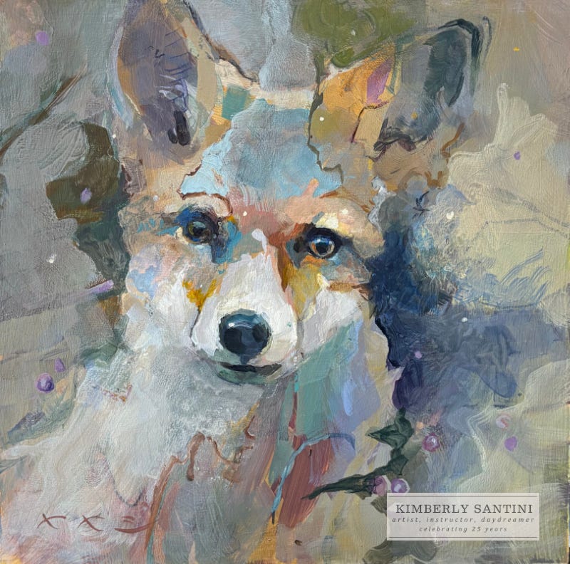 I don’t often take on commissions, but this one ticked all the boxes for me. Also, I told my collectors that I was approaching their concept of Fox in the woodland like a gentle suggestion as opposed to a static list of bullet points that, for me, can stifle the joy of the painting process. After over a decade of nearly daily pet portraiture, I got a burned out on painting for others and guess I still am a bit tender.